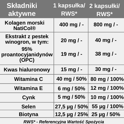 Składniki: Kolagen ze skór ryb morskich NatiCol®, inulina, kwas L-askorbinowy (witamina C), ekstrakt z nasion winorośli właściwej (Vitis vinifera) DER 15:1 stand. na 95% proantocyjanidynów (OPC), kwas hialuronowy, L-leucyna, octan DL-alfa tokoferylu (witamina E), glukonian cynku (cynk), selenian (IV) sodu (selen), D-biotyna (biotyna), otoczka kapsułki: hydroksypropylometyloceluloza.