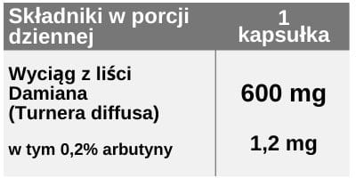 Każda kapsułka zawiera 600 mg wyciągu z liści Turnera diffusa, w tym 1,2 mg arbutyny.